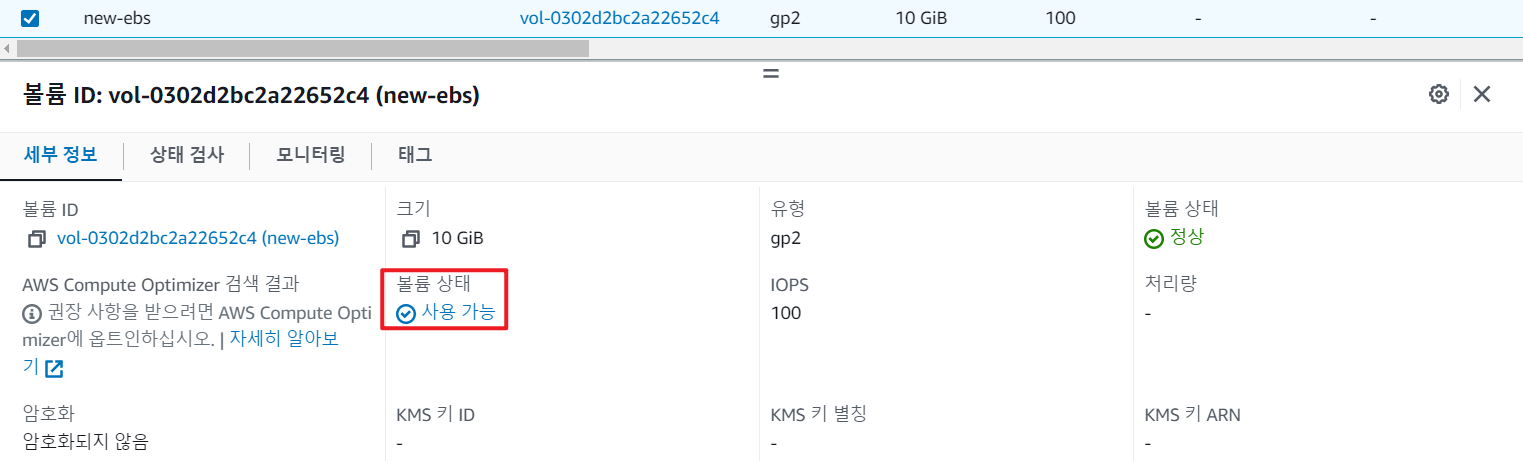 볼륨이 생성되면 볼륨상태가 생성중 -> 사용 가능 으로 바뀝니다.