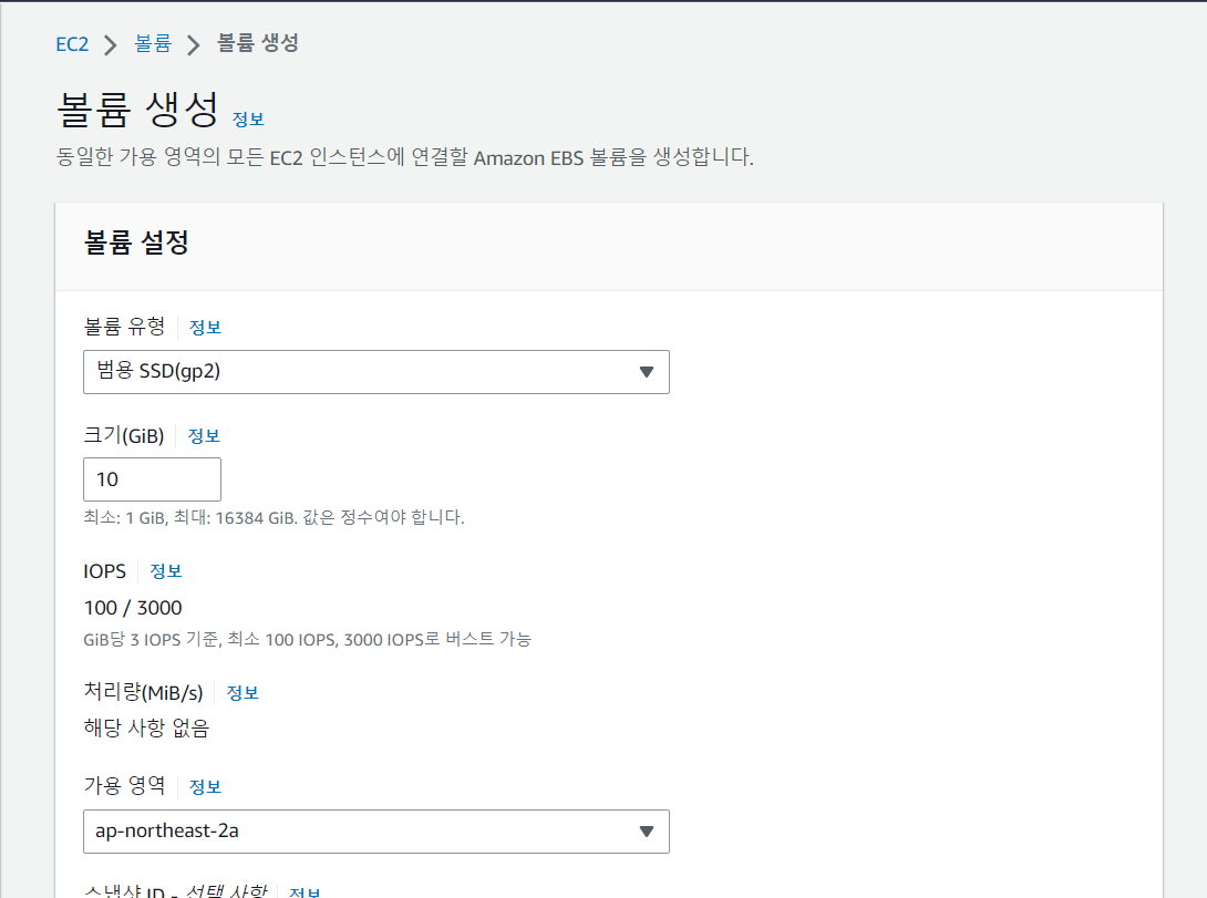 * 이때 주의할 점은 볼륨을 연결할 인스턴스가 신규 생성하는 볼륨과 같은 가용영역에 위치해야 합니다.