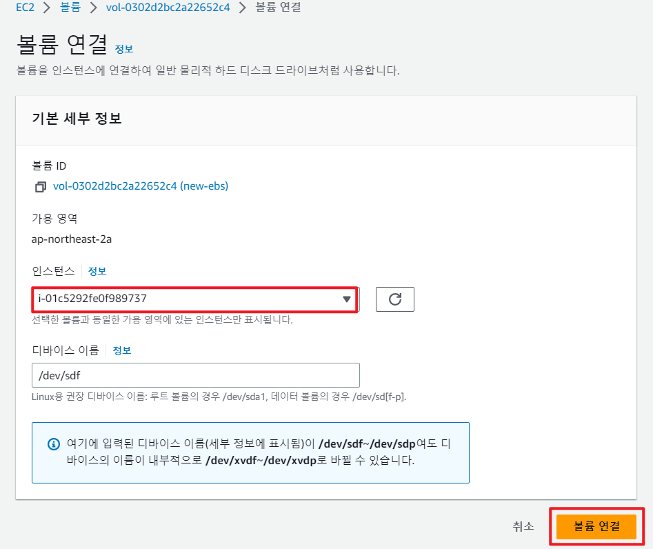 연결할 인스턴스와 디바이스 이름을 설정하여 줍니다. 디바이스 이름은 웬만하면 권장 사항을 따르도록 합니다.