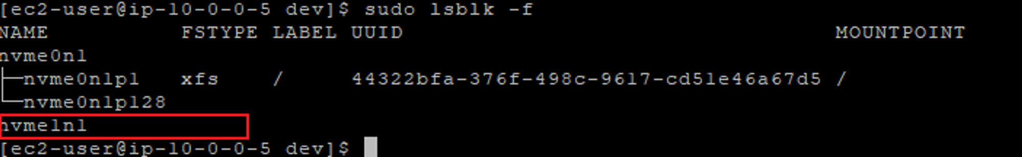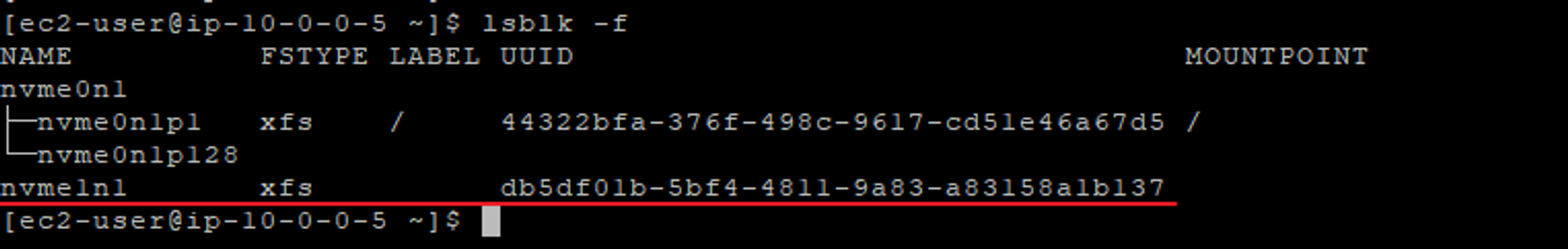 기존 연결되어 있는 Root 볼륨인 nvme0n1 과 다르게 nvme1n1에는 파일시스템이 아직 없는 것으로 확인됩니다. 따라서 파일시스템을 생성해 주어야 합니다. 루트볼륨과 같은 xfs 타입으로 생성하도록 하겠습니다.
