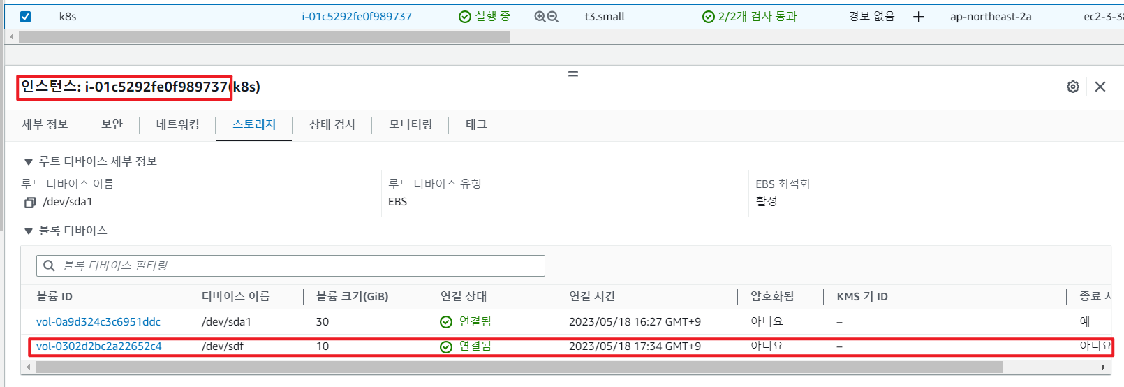 볼륨이 연결되면 인스턴스 상세페이지 > 스토리지 탭에서 새로 연결한 EBS 볼륨이 보이는 걸 확인할 수 있습니다.