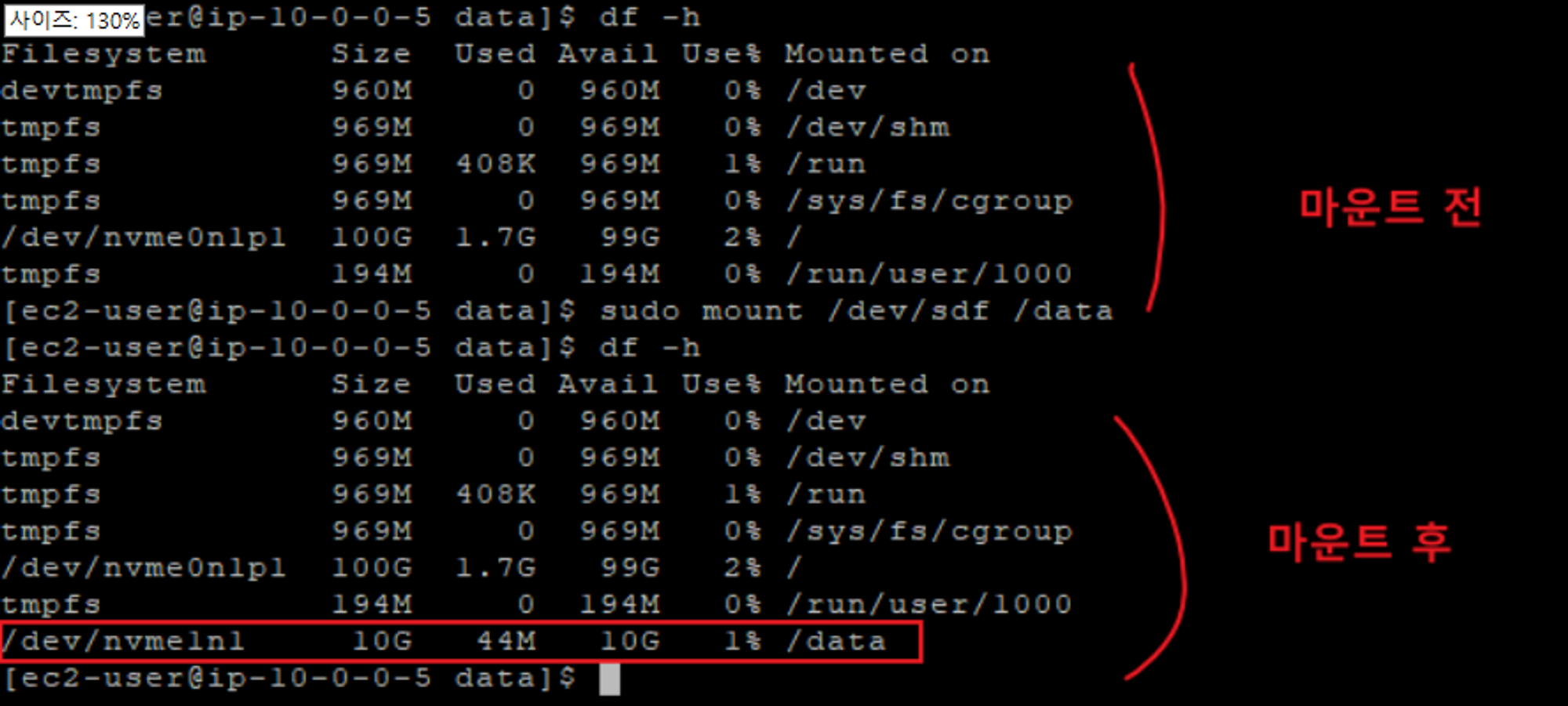 df -h 명령어를 통해 마운트가 잘 되었는 지 확인해 봅니다.