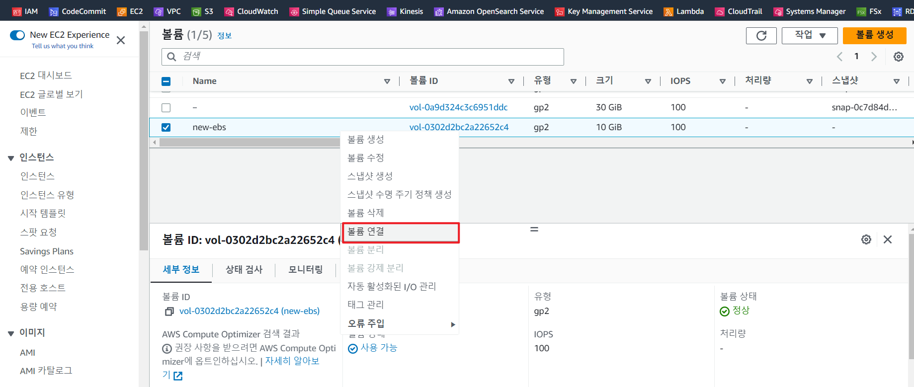 생성된 볼륨을 선택하고 오른쪽 마우스 버튼을 클릭하여 드롭다운을 활성화 합니다. 볼륨 연결 클릭!