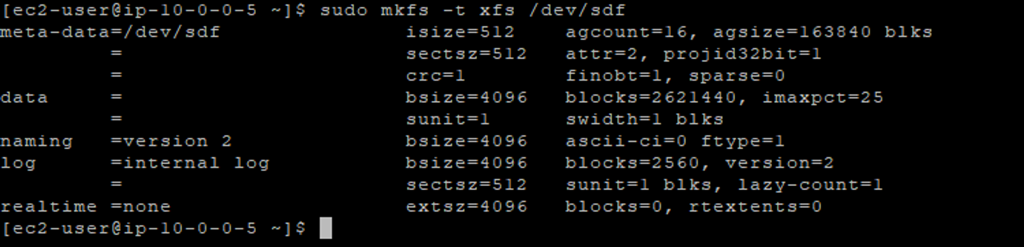 sudo mkfs -t xfs /dev/sdf