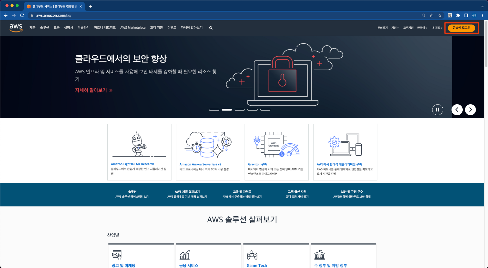 aws 홈페이지에 접속하여 콘솔에 로그인 합니다.