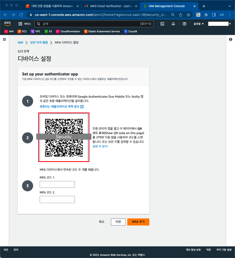 로그인을 하면 자동으로 보안 인증 페이지로 이동하게 됩니다. 기존 MFA는 제거 하고 새로운 MFA를 등록해줍니다.
