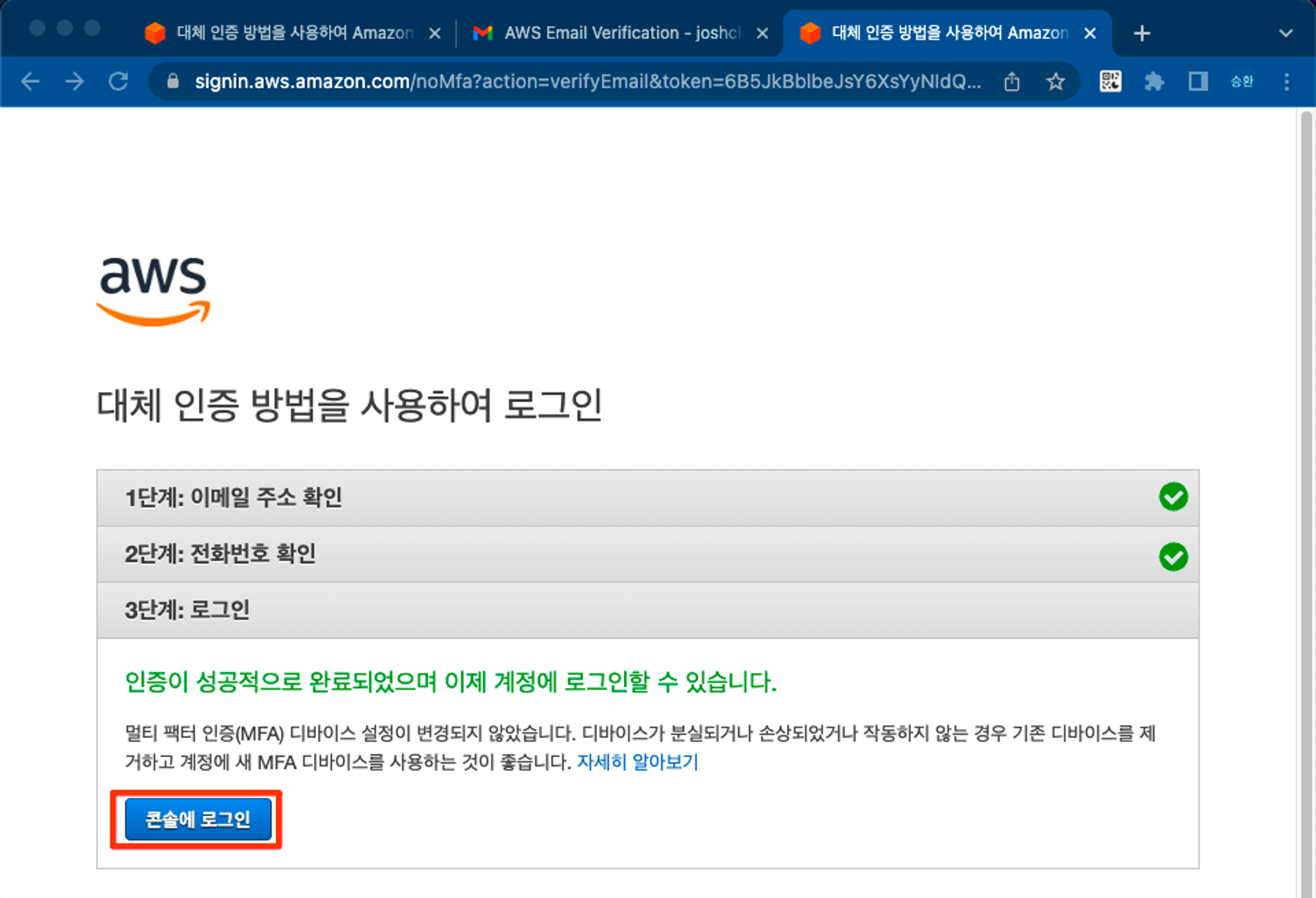 MFA가 활성화된 계정에 MFA 없이 로그인 하기 위해서는 이메일과 전화 ARS 인증 두 단계나 거쳐야 합니다.