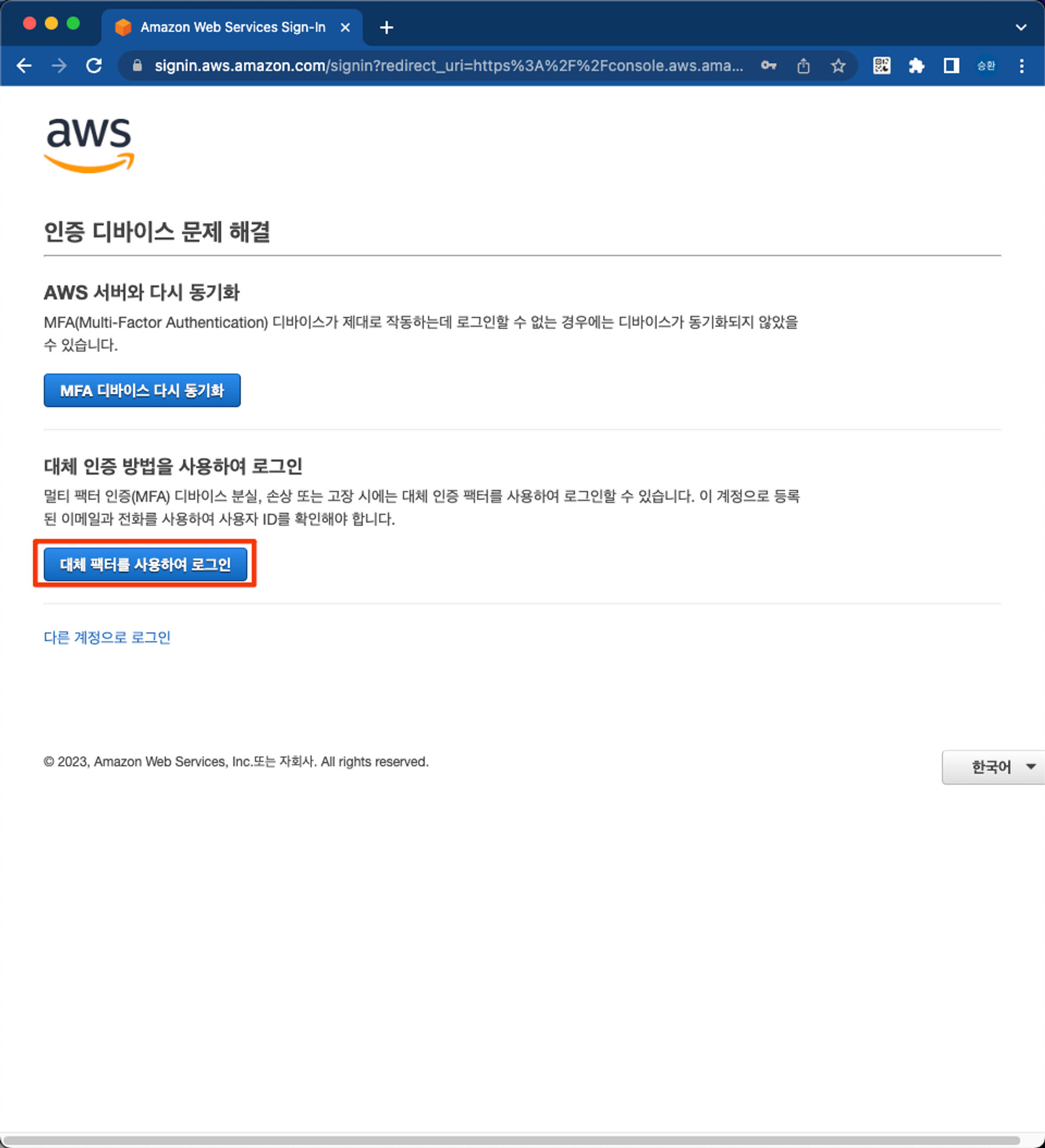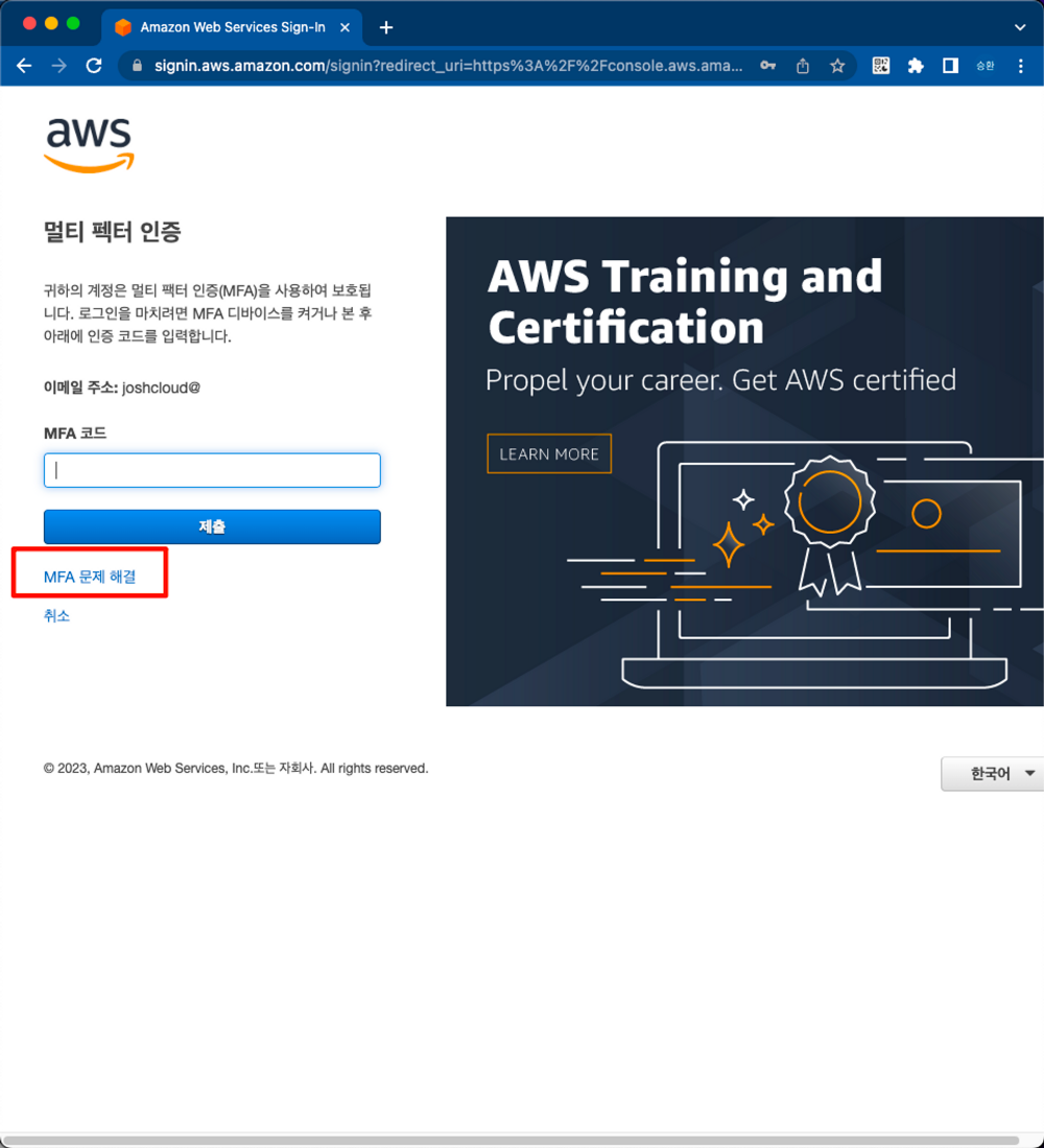 계정 이메일 주소 및 비밀번호를 입력한 후 다음화면에서 'MFA 문제 해결'을 클릭합니다.