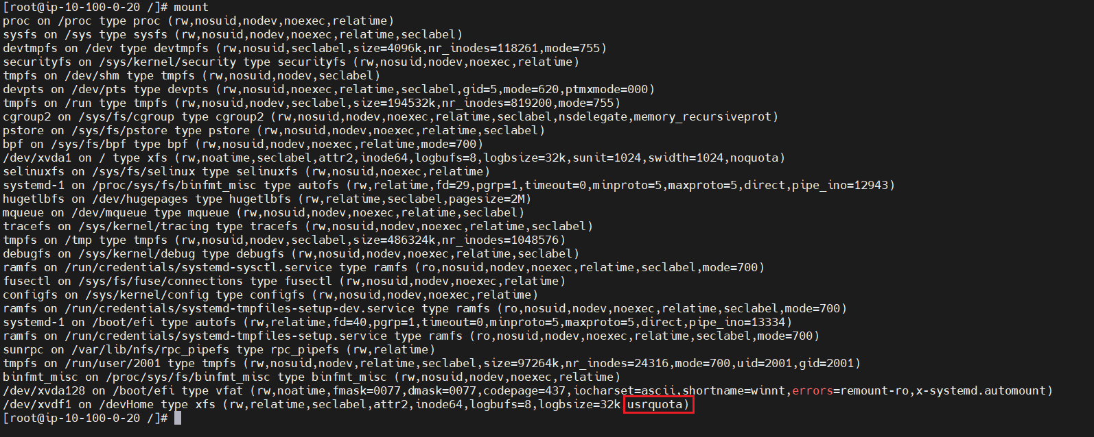 맨 아래줄에 방금 마운트한 디스크에 usrquota 속성이 적용된 것을 확인합니다.