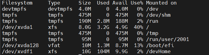 디스크 xvda1, xvdf1 의 경우 파일시스템이 xfs로 지정되어 있습니다. 만일 xfs가 아니라면 필요의 경우 mkfs 명령어를 통해 바꿔주도록 합니다.