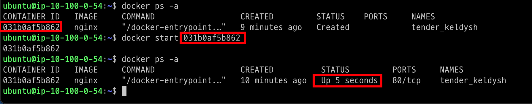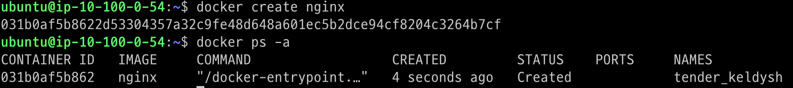 명령어를 수행하면 상태가 가장 초기 상태인 Created가 됩니다. 이는 컨테이너의 설정과 파일 시스템이 준비되었지만 아직 실행은 되지 않은 상태입니다.
