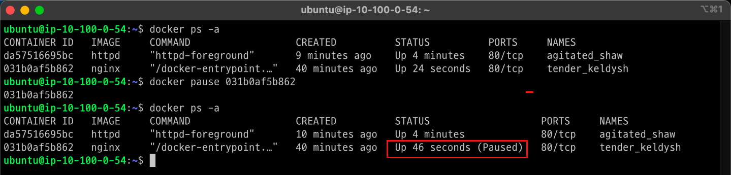 컨테이너 내의 모든 프로세스가 정지되어 CPU 및 메모리 사용이 중단됩니다.