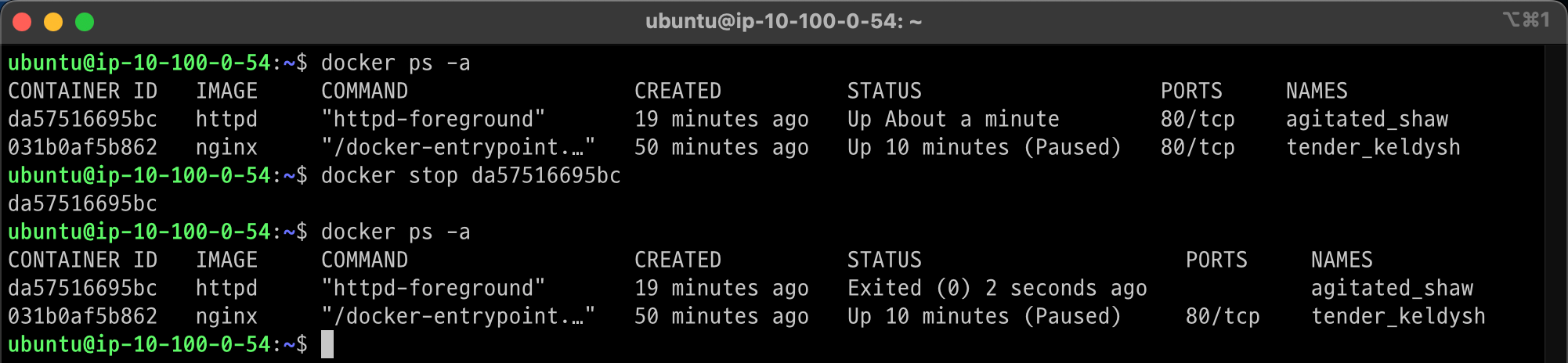 이때 docker run 과 다른 점은 이미 생성된 컨테이너를 실행하는 것입니다.