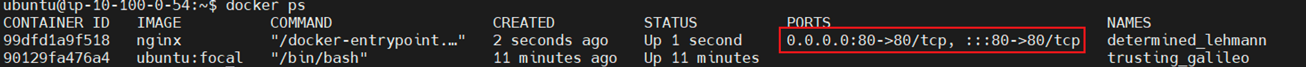docker ps 명령어를 보면 아래와 같이 PORTS 필드에 HostOS:컨테이너가 80:80 으로 바인딩된 것을 볼 수있습니다.