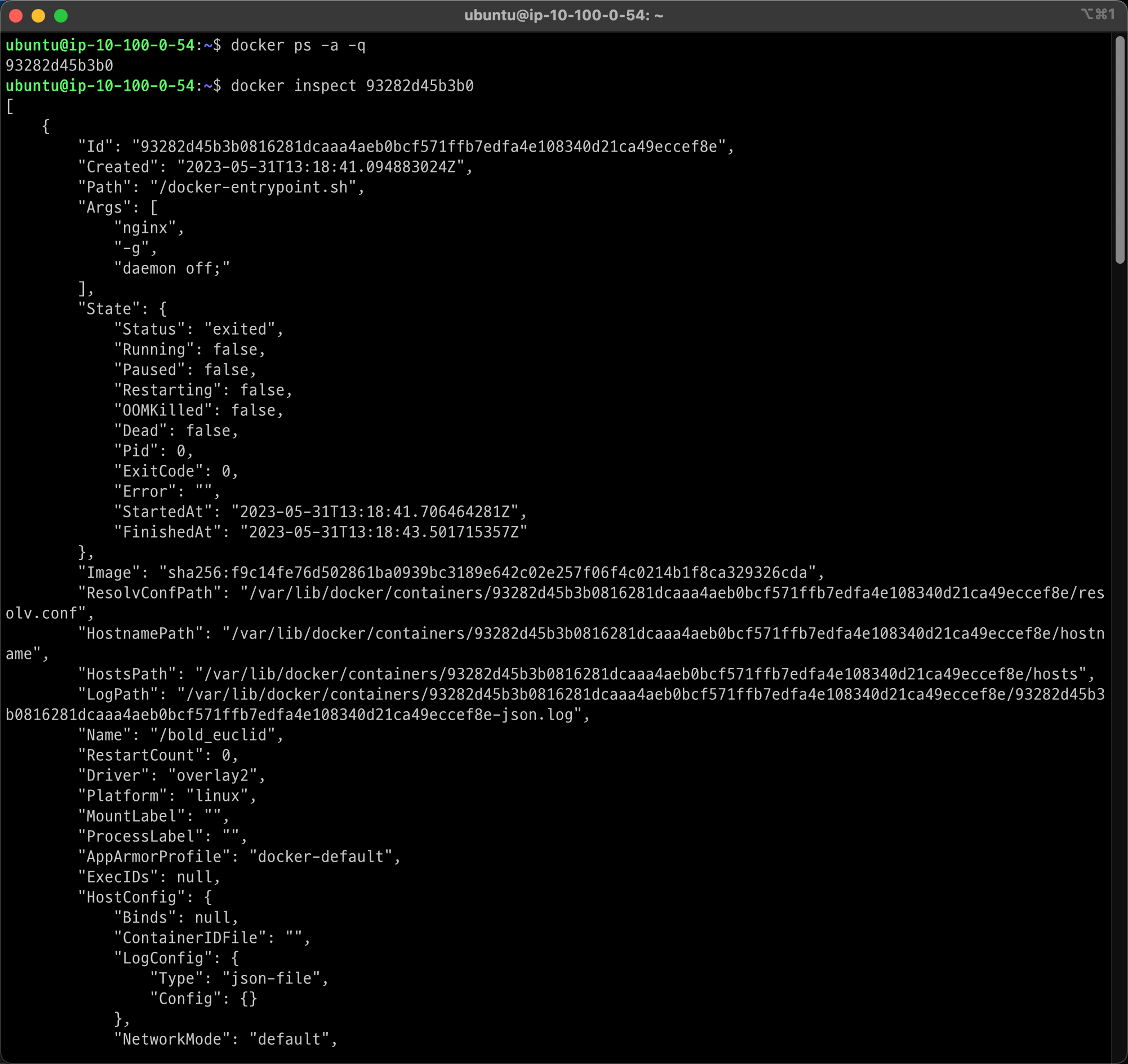 docker inspect 명령어를 실행하면 해당 컨테이너 또는 이미지에 대한 상세한 정보가 JSON 형식으로 출력됩니다. 이 정보에는 개체의 ID, 상태, 네트워크 설정, 볼륨 마운트, 환경 변수, 포트 매핑 등 다양한 속성과 구성이 포함될 수 있습니다.