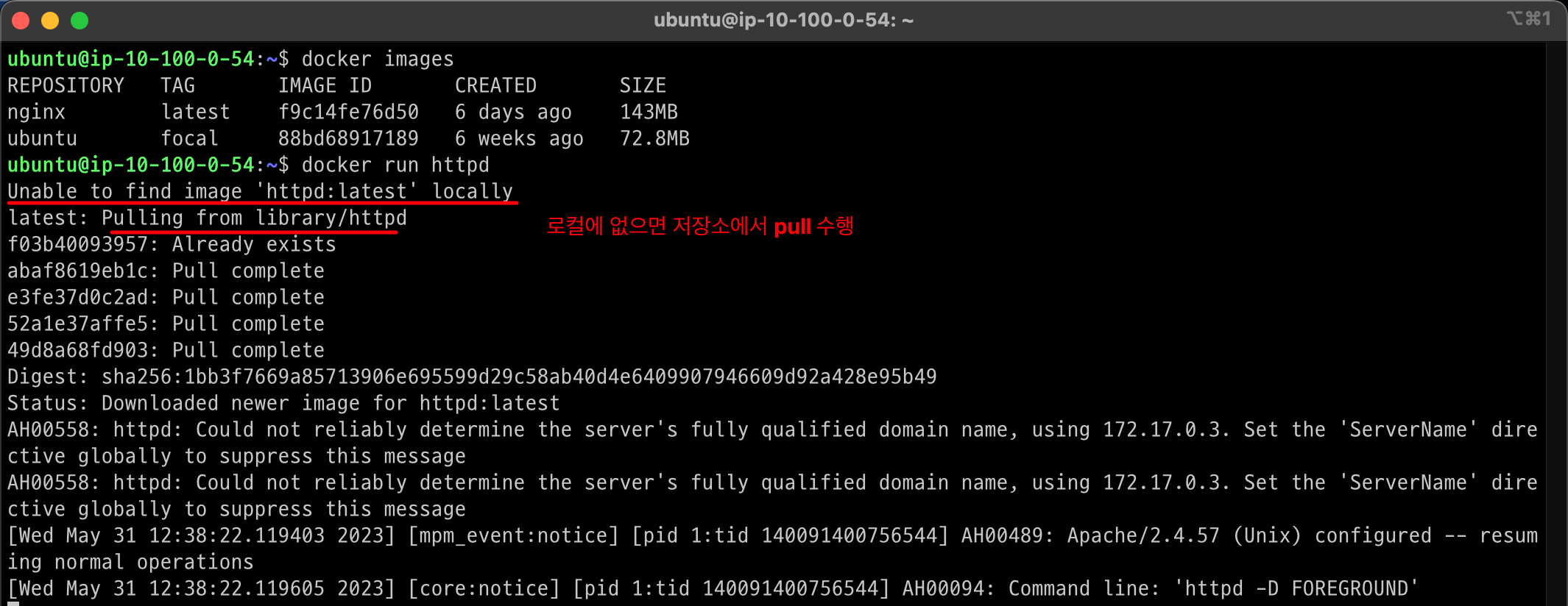 docker run [옵션] [이미지]이때, 이미지가 없으면 자동으로 default 저장소에서 이미지를 pull 하여 다운받습니다. 이 때, 별 다른 설정을 안했다면 default 저장소는 Docker hub 입니다.