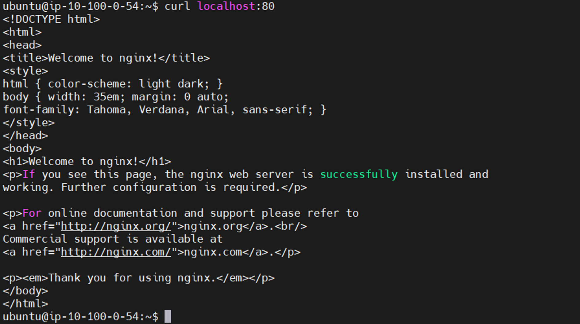 컨테이너 정상작동 확인을 위해 curl 명령어를 수행해봅니다.