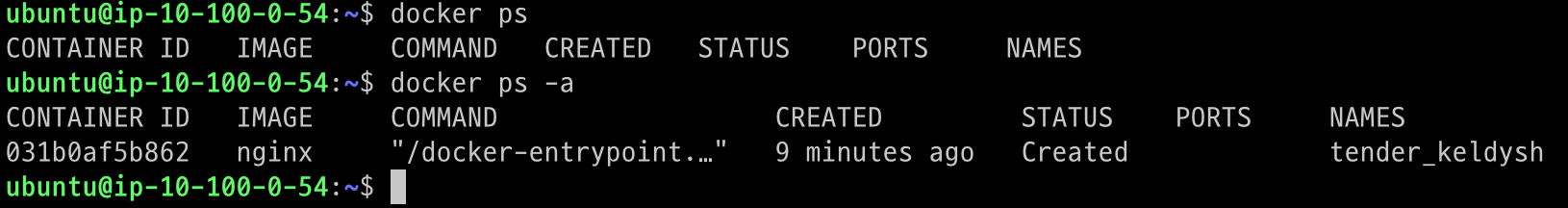 docker create [옵션] [이미지명]명령어를 수행하면 상태가 가장 초기 상태인 Created가 됩니다. 이는 컨테이너의 설정과 파일 시스템이 준비되었지만 아직 실행은 되지 않은 상태입니다.