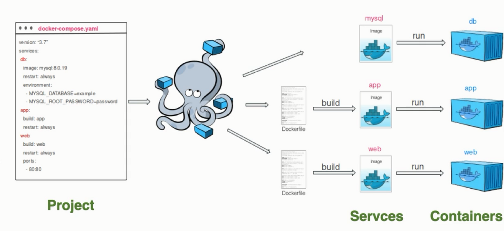 여러개의 컨테이너로 구성된 여러 서비스를 프로젝트 단위로 묶어서 같은 네트워크나 볼륨등을 사용하게 하고 이를 모두 docker-compsoe.yml 이라는 파일로 명세하여 관리할 수 있도록 하는 것이 docker-compose 입니다.