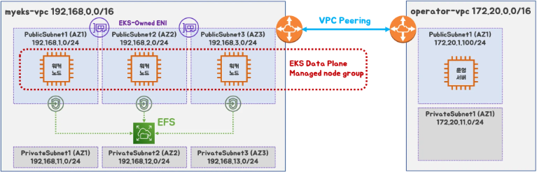 - 2개의 VPC: EKS 배포용(myeks-vpc)과 운영용(operator-vpc)으로 구분