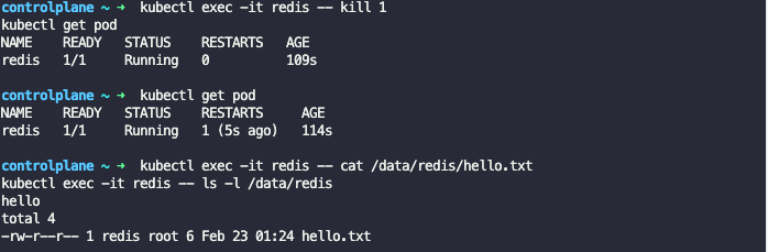 redis 프로세스를 강제로 종료하게 되면 컨테이너가 종료됩니다. 이 때 컨테이너는 종료되도 Pod는 살아있기 때문에 데이터는 유지됩니다.