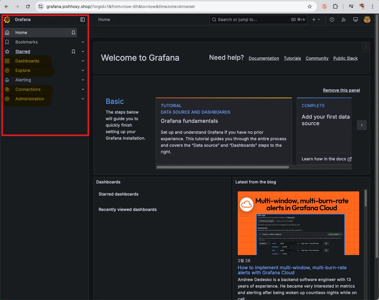 - Connections – Prometheus, Loki, MySQL, Elasticsearch 등 다양한 데이터 소스를 Grafana와 연결하고 설정하는 메뉴.