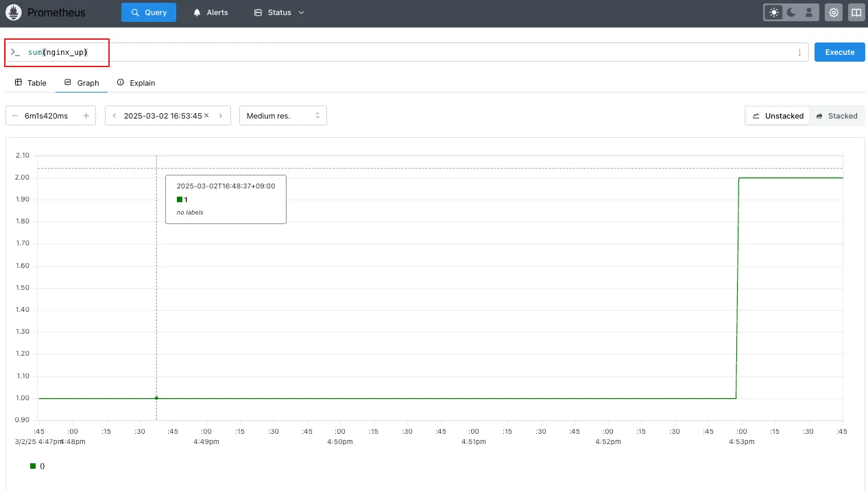 sum(calculate sum over dimensions) : 조회된 값들을 모두 더함min(select minimum over dimensions) : 조회된 값에서 가장 작은 값을 선택max(select maximum over dimensions) : 조회된 값에서 가장 큰 값을 선택avg(calculate the average over dimensions) : 조회된 값들의 평균 값을 계산group(all values in the resulting vector are 1) : 조회된 값을 모두 ‘1’로 바꿔서 출력stddev(calculate population standard deviation over dimensions) : 조회된 값들의 모 표준 편차를 계산stdvar(calculate population standard variance over dimensions) : 조회된 값들의 모 표준 분산을 계산count(count number of elements in the vector) : 조회된 값들의 갯수를 출력 / 인스턴스 벡터에서만 사용 가능count_values(count number of elements with the same value) : 같은 값을 가지는 요소의 갯수를 출력bottomk(smallest k elements by sample value) : 조회된 값들 중에 가장 작은 값들 k 개 출력topk(largest k elements by sample value) : 조회된 값들 중에 가장 큰 값들 k 개 출력quantile(calculate φ-quantile (0 ≤ φ ≤ 1) over dimensions) : 조회된 값들을 사분위로 나눠서 (0 < $ < 1)로 구성하고, $에 해당 하는 요소들을 출력