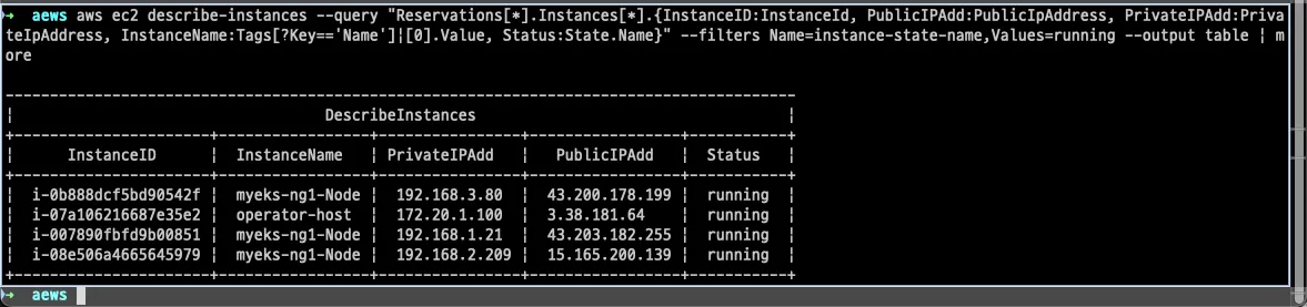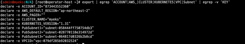 aws cloudformation describe-stacks --stack-name myeks --query 'Stacks[*].Outputs[0].OutputValue' --output text