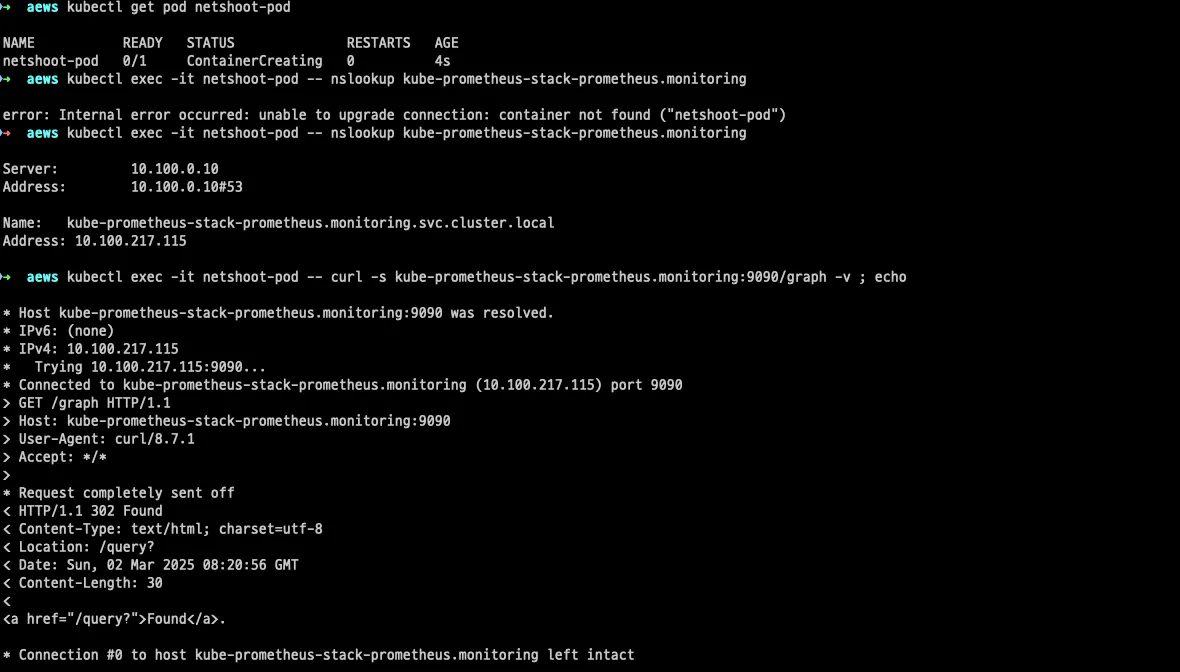 kubectl exec -it netshoot-pod -- curl -s kube-prometheus-stack-prometheus.monitoring:9090/graph -v ; echo
