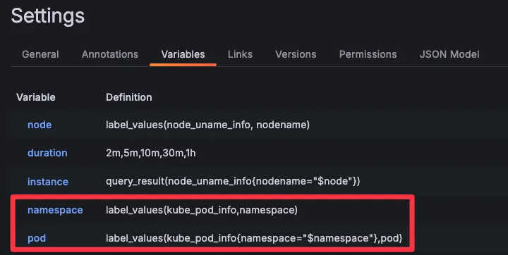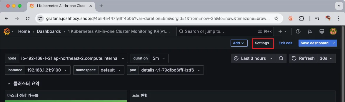 오른쪽 상단 Edit → Settings → Variables 아래 namesapce, pod 값 수정 ⇒ 수정 후 Save dashboard 클릭합니다.