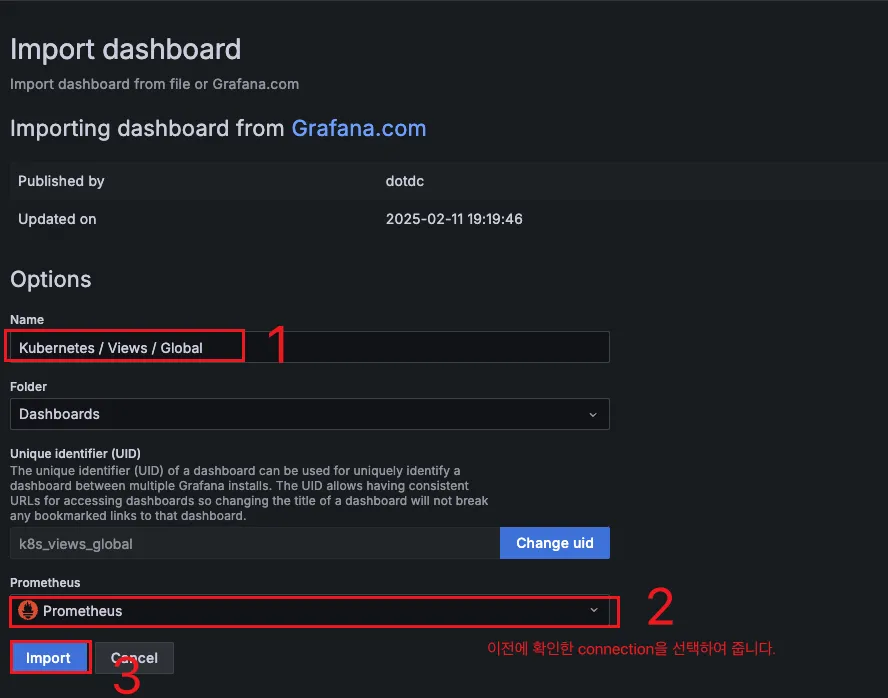 - [Kubernetes / Views / Global] Dashboard → New → Import → 15757 력입력 후 Load ⇒ 데이터소스(Prometheus 선택) 후 Import 클릭