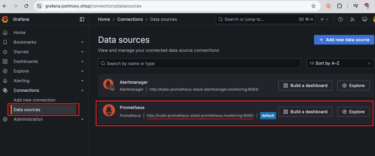 그라파나가 원천 데이터를 수집하기 위해서는 connection 설정이 반드시 되어있어야 합니다. 이번 실습에서는 프로메테우스와 연동이 되어있기 때문에 해당 설정을 살펴보겠습니다.