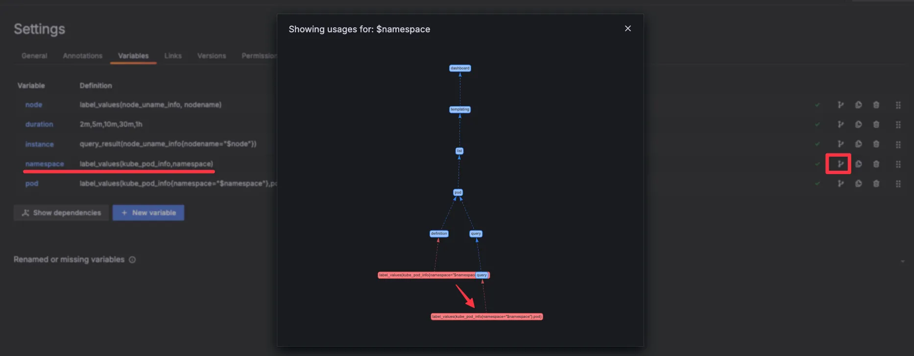 namespace 오른쪽 Showing usages for 클릭 시 → 맨 하단에 pod variable 가 namespace 를 하위에 종속? 관계 확인