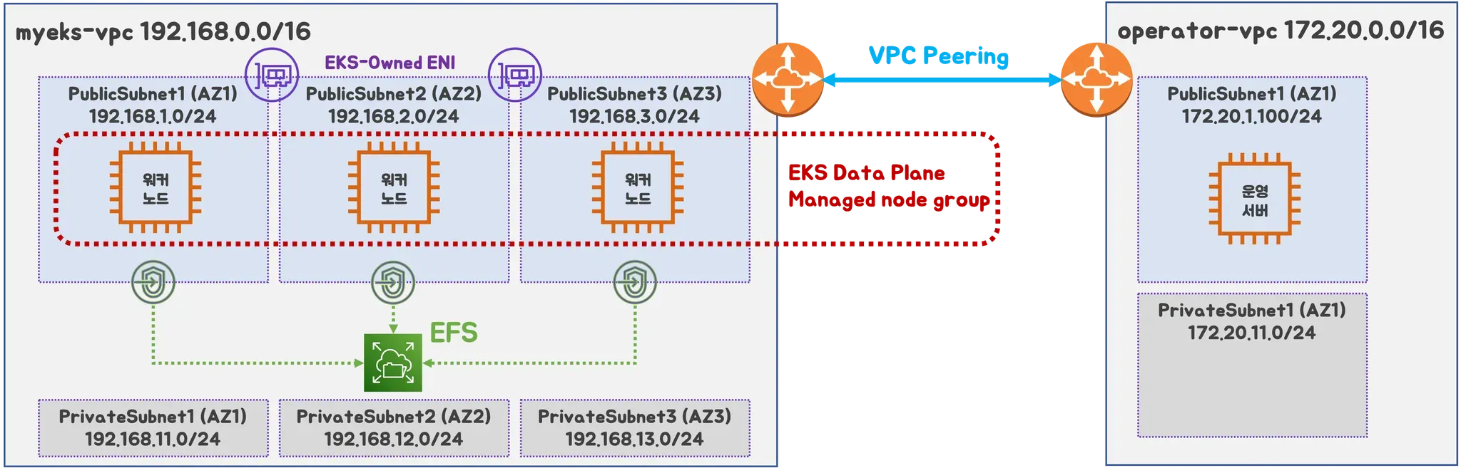 - VPC Peering (상용 서비스의 경우 온프레미스 IDC 에서의 작업자 PC, DX 혹은 VPN 구성