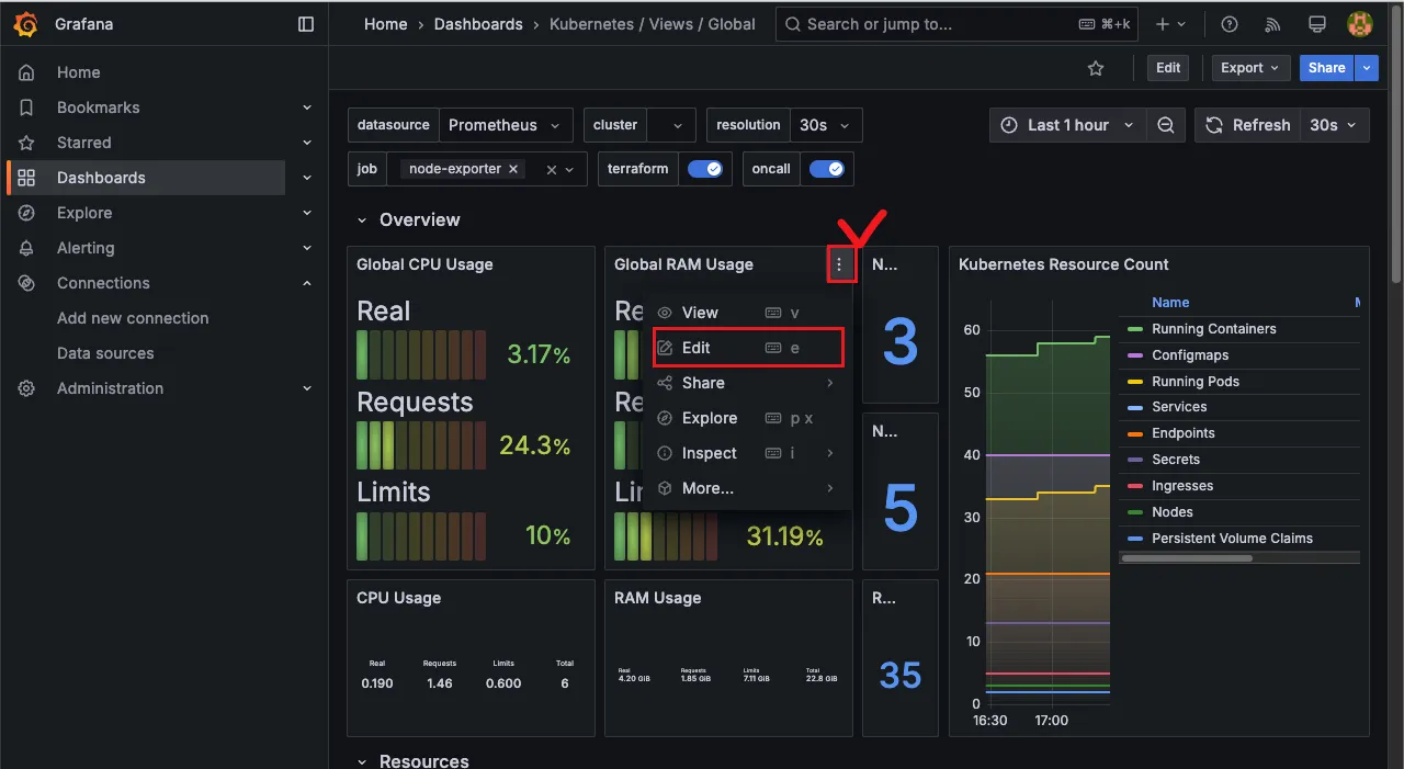 - (대략) 분류 : 자원 사용량 - Cluster/POD Resources, 노드 자원 사용량 - Node Exporter, 주요 애플리케이션 - CoreDNS 등