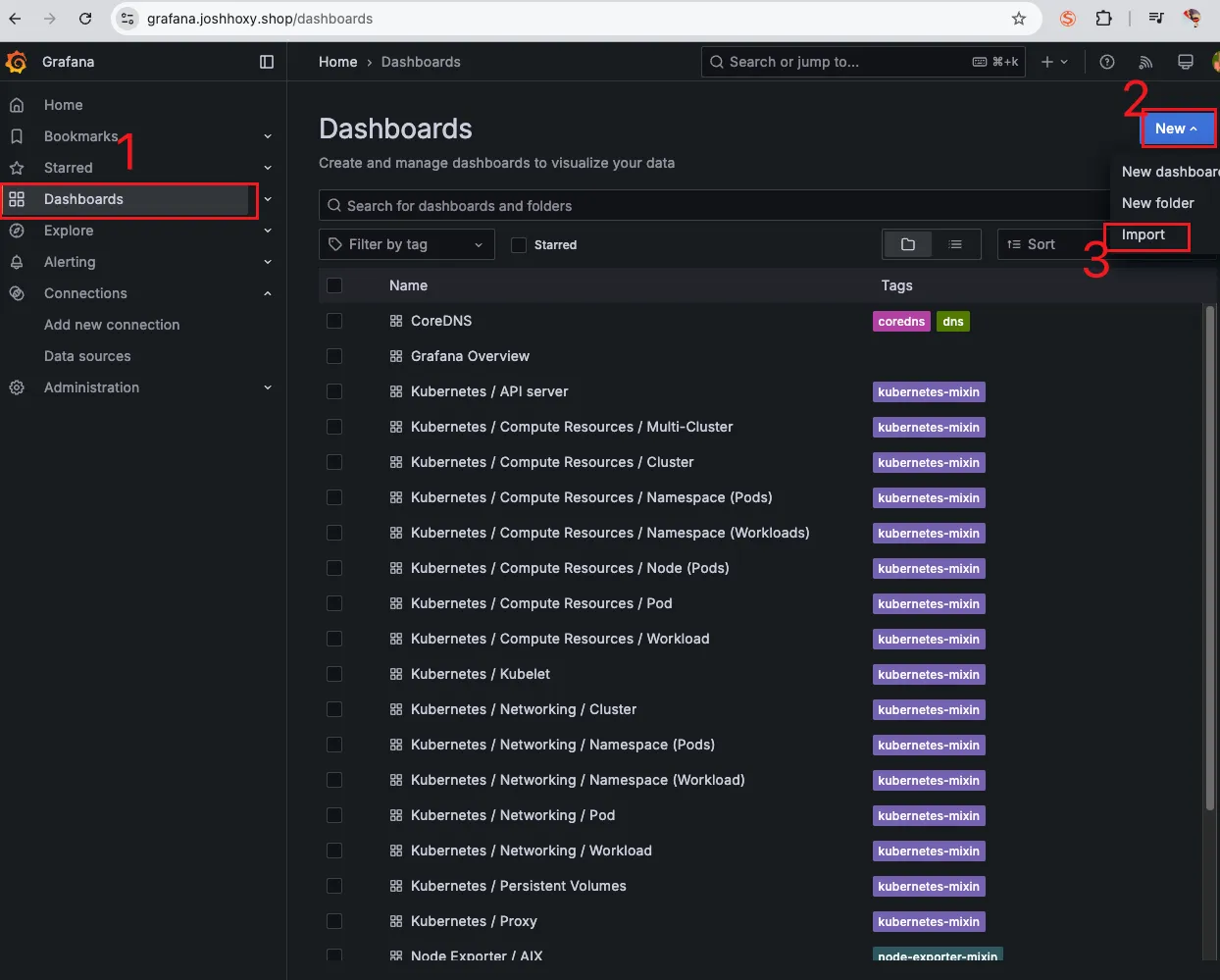 - [1 Kubernetes All-in-one Cluster Monitoring KR] Dashboard → New → Import → 17900 입력 후 Load ⇒ 데이터소스(Prometheus 선택) 후 Import 클릭