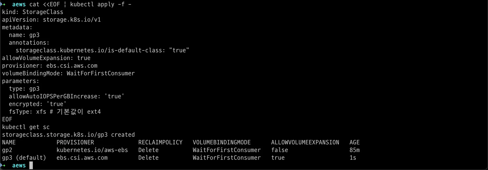 aws cloudformation deploy --template-file myeks-5week.yaml --stack-name $CLUSTER_NAME --parameter-overrides KeyName=$SSHKEYNAME SgIngressSshCidr=$(curl -s ipinfo.io/ip)/32 MyIamUserAccessKeyID=$MYACCESSKEY MyIamUserSecretAccessKey=$MYSECRETKEY ClusterBaseName=$CLUSTER_NAME --region ap-northeast-2