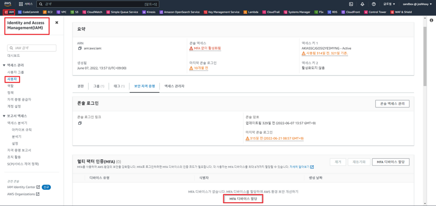 ◾ AWS 콘솔 > IAM 서비스 > 사용자 메뉴 > 보안 자격 증명 탭 > MFA 디바이스 할당 클릭