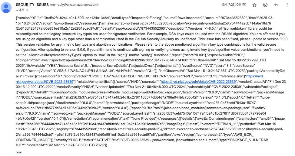이미지를 푸시하면 해당 repository는 continuous 스캔이 켜져있기 때문에 이미지가 스캔되고 발견된 취약점이 위 파이프라인을 통해 메일로 전송됩니다.