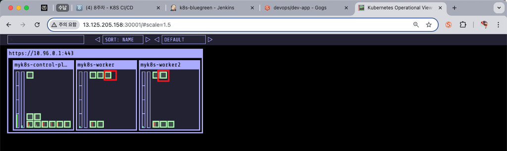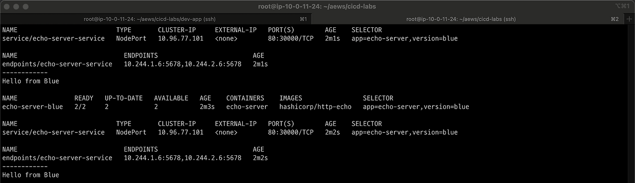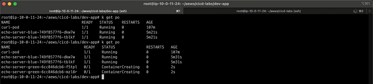 yes를 클릭하면 서비스가 스위칭 되어 curl 명령어 결과가 green 으로 나타나는 것을 볼 수있습니다.