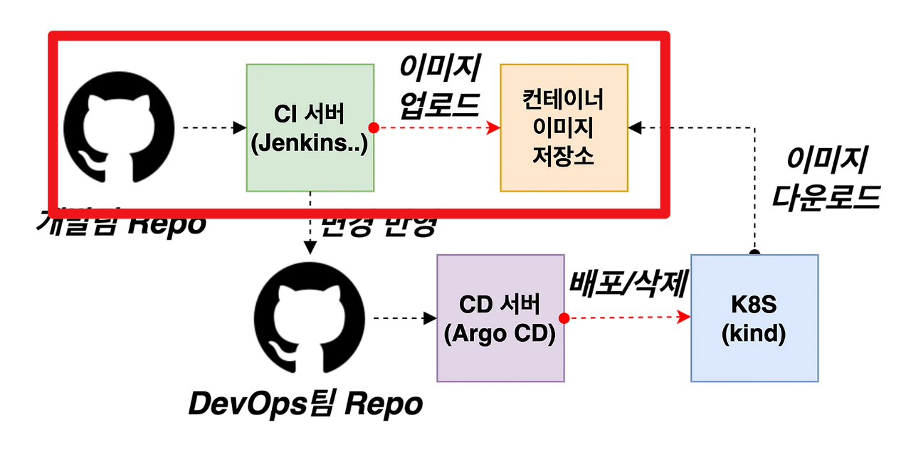 이후 DevOps 팀의 GitHub Repository에는 배포를 위한 설정이나 매니페스트가 저장되어 있으며, 변경 사항이 생기면 CD 서버(Argo CD 등)가 이를 감지하여 Kubernetes 클러스터(kind 환경)에 자동으로 배포하거나 삭제하는 작업을 수행합니다.