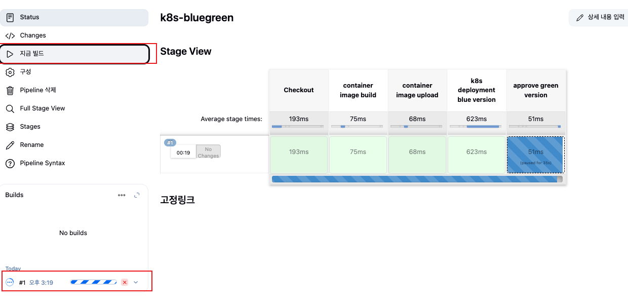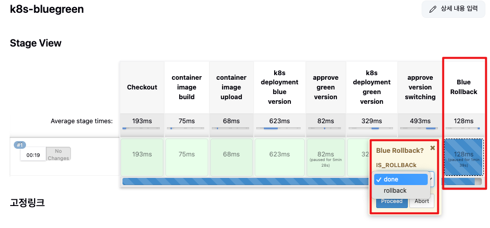 젠킨스에서 새로운 스테이지(Blue Rollback)이 생겨난걸 확인 가능합니다. 이제 서비스가 예상한대로 배포가 되었다면 done을, 아니라면 rollback 을 선택합니다.