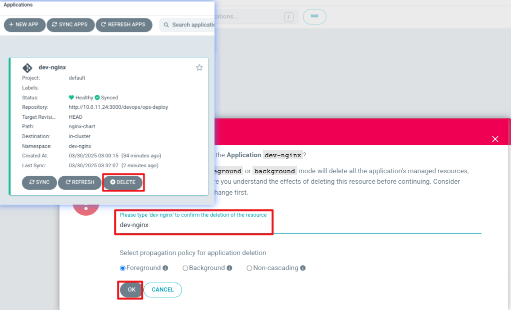 ArgoCD App of Apps 을 삭제할때는 cascade 방식으로 삭제됩니다.