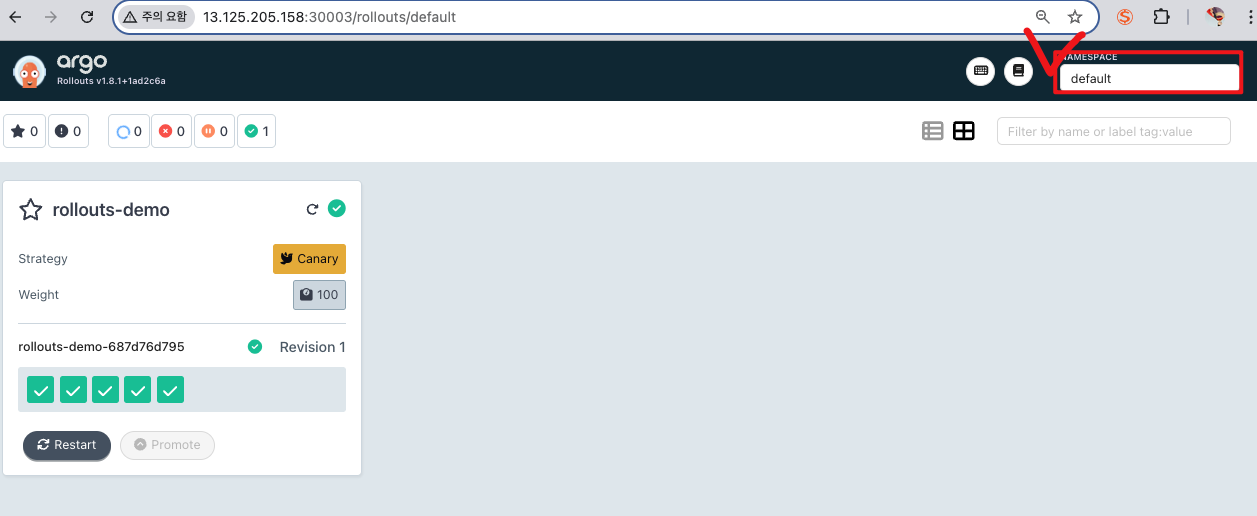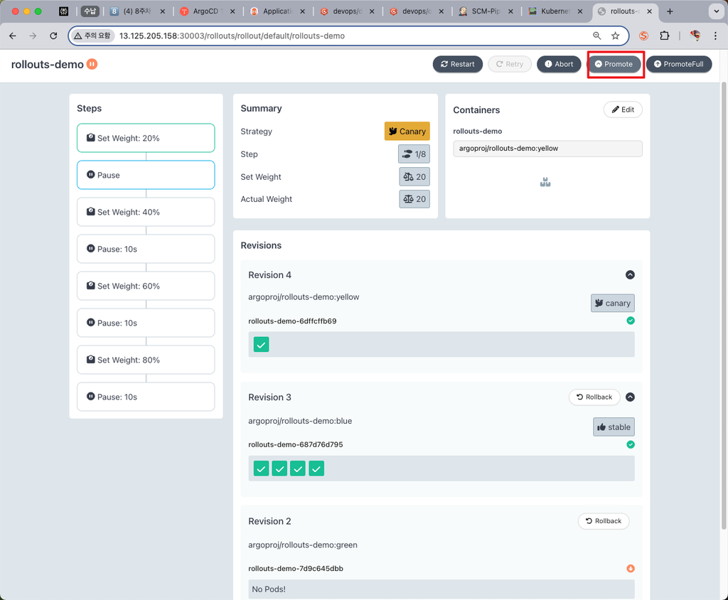 신규 파드를 모니터링 하고 상태가 괜찮다면 우측 상단의 promote를 하여 점진적으로 20% 씩 배포합니다.