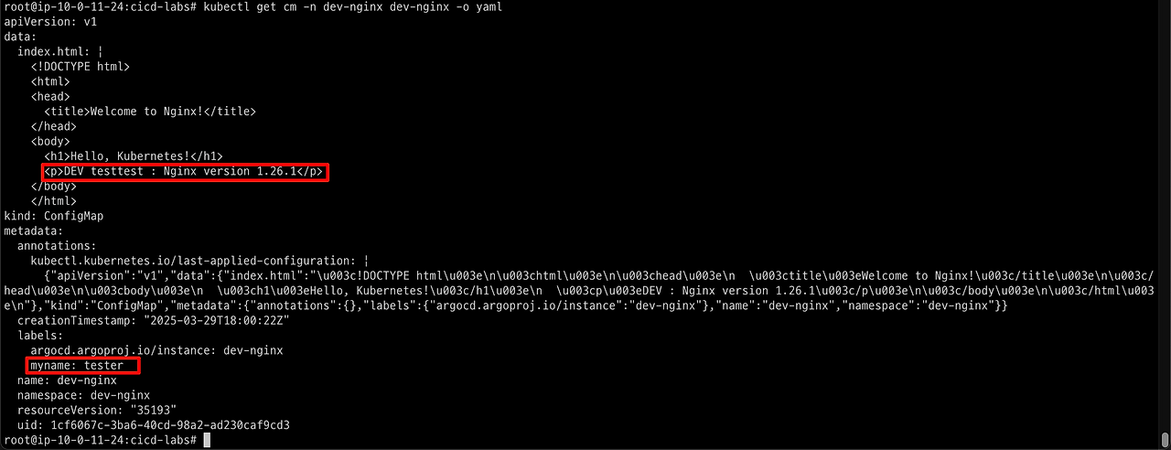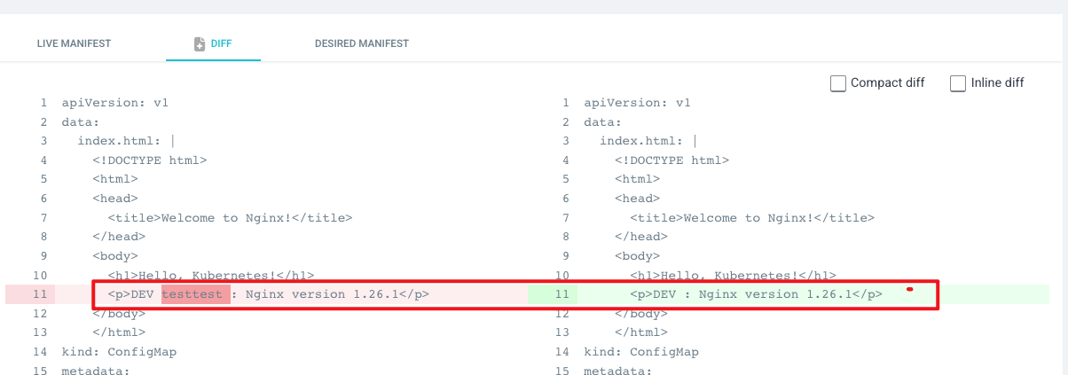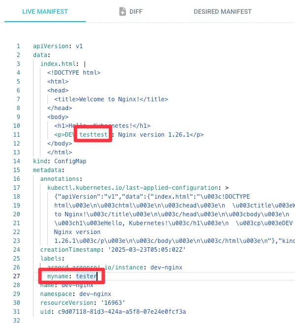 또한 반대로도 kubectl로 configmap을 변경해도 LIVE MANIFEST에 반영이 되는 것을 확인할 수 있습니다. LIVE MANIFEST는 쿠버네티스 리소스를 실시간으로 추적하여 해당 상태를 보여주는 것입니다.
