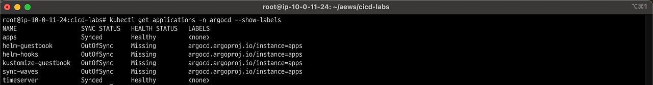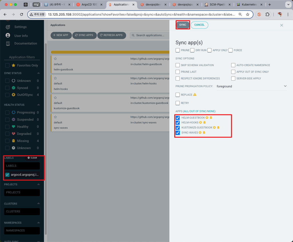 싱크 안맞는 녀석들을 싱크해줍니다. 애플리케이션 대시보드에서 라벨링을 걸어서 필터링 해줍니다.