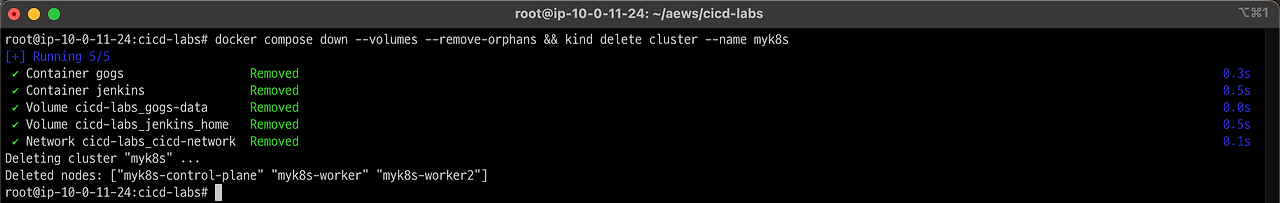 **docker compose down --volumes --remove-orphans && kind delete cluster --name myk8s**