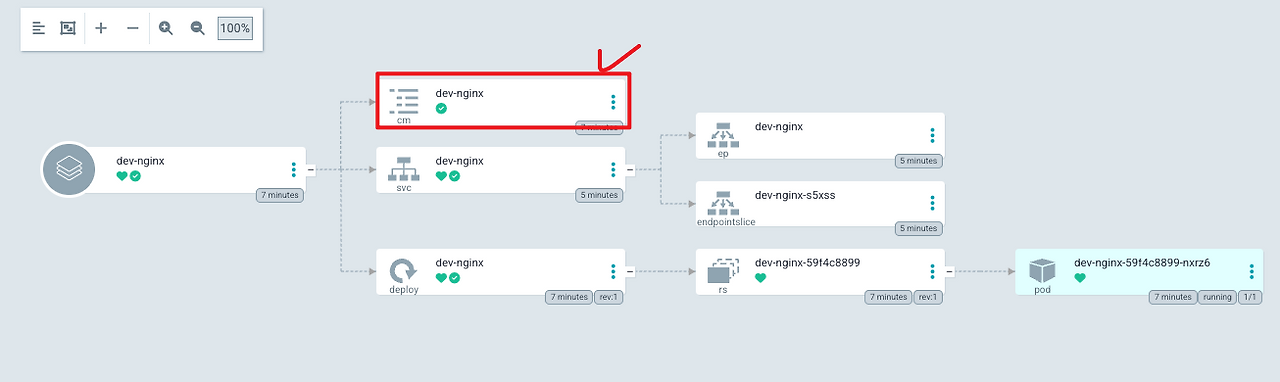 application을 생성하면 다음과 같이 대시보드에 새로운 위젯이 생성됩니다. 해당 위젯을 클릭하면 다음과 같이 configmap, svc, deployment 등의 리소스가 표시되는 것을 확인할 수 있습니다.