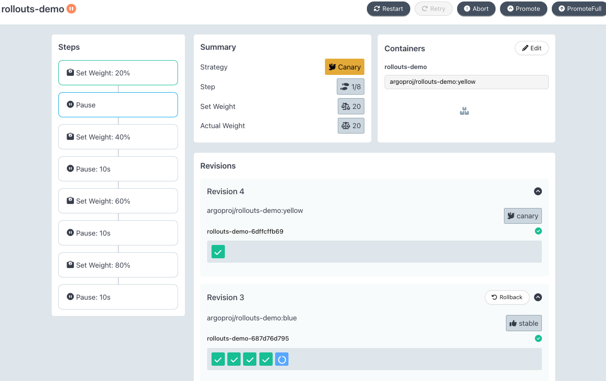 spec: replicas: 5 strategy: canary: steps: - setWeight: 20 - pause: {} - setWeight: 40 - pause: {duration: 10} - setWeight: 60 - pause: {duration: 10} - setWeight: 80 - pause: {duration: 10}