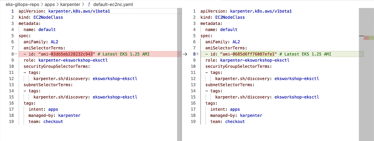 새로운 그린 클러스터 환경에 맞게끔 카펜터의 노드클래스 AMI를 변경하여 줍니다.